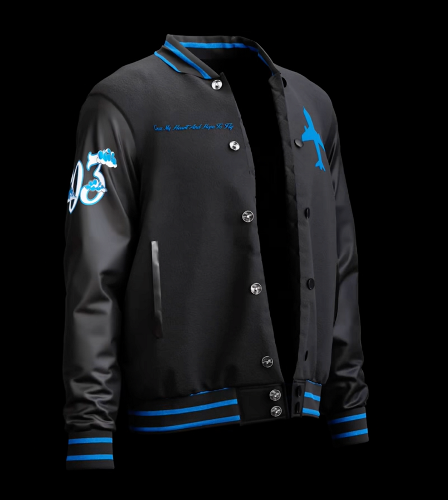 This Varsity Cloak in Signature Black and Blue is enhanced by an embroidered motto on the right chest, featuring a signature chenille plane on the left chest. Additional details include a chenille '03 patch on geniuine leather sleeves and an oversized chenille logo across the back. As a limited made-to-order item, this piece embodies an American classic is elevated to a new level.